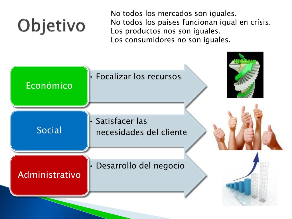 No todos los mercados son iguales. • No todos los países funcionan igual en crísis. • Los productos nos son iguales. • Los consumidores no son iguales. Objetivo