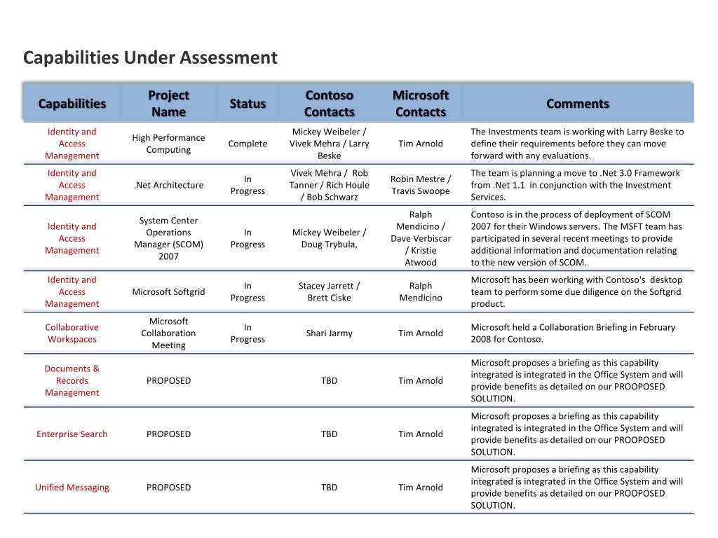 Do Not Print • ContosoProvided ‘IT Transformation Roadmap’ – Make a strong effort to obtain customer content for this page. Usually a customer 5 year vision or graphic depicting their vision for IT. Substitute overall Bus Goals graphic if IT specific is not avail. This Bus goals graphic will match the exec summary terms. • Business Priorities & Alignment - Goal – to be knowledgeable about customer prior to first v-team meeting and to know top 3+ key business priorities. Start with the EBC AIO / Account Plan content already compiled by the Sales Desk. Column data for IT Priorities, IT Projects and Related Capabilities all need to come from the AM/v-team/. Supplement with Proposal Manager research in order via • Customer Doc Store – AB (Account Backgrounder); AIO (EBR All-In-One); BTS (Business Tear Sheet = Stratascope); CAP (Customer Account Plan); SGP (Services Growth Plan) • Customer Web Site – Look for ‘About Company’, Products & Services, Investor Relations (download Annual Report, SEC Filings 10K & recent 10Q (read MD&A), Press/News Releases, note top finance and IT names/titles. Document notes in OneNote for later reference and to store in Collaboration site. • MS Library Research Databases - LexisNexis Company Dossier – Create and download to .doc a Snap Shot report, note # of employees, fiscal year end, primary SIC, list of competitors • Explore.MS – Save .xlsx of all EA Agreements and Select agreements. Use one workbook with multi-tabs. This will be used often for reference. If there are >5 agreements, work with LS to have them create the workbook and perhaps a pivot table of all agreements together. Use this to determine total desktops, true-up history, production vs. pilot quantities, Step-up oppys, etc. To create a form for Proposal Manager to complete which summarizes data insights from the agreement data. Can use TPID or Agreement numbers from EBR. • TARGETED CAPABILITY GROWTH AREAS – Use to record the IO Assessment levels at sub-capability levels, to document the incumbent technologies by vendor and product name, and to comment on the deployment status of the incumbent technology. Describe if technology is enterprise wide, which version and how many back from current version, departmental use only, supporting a specific business process, etc. May use the last column as a description field. • Need field to provide data for columns 3 & 4. • Proposal Desk to complete column 2 from data in the IOTS in the Customer Doc Store . • Use the red bar to highlight the capabilities we are focused on selling via this proposal = we’ll be discussing those capabilities in the solution section. • CAPABILITIES UNDER ASSESSMENT - List out the MSFT capabilities under review = have had or have upcoming briefings, have used the MTC, or a partner, or MCS or other in-house pilot, etc. Also to list out proposed briefing areas based on the capabilities being proposed. i.e. ECAL suite includes more capabilities than customer may have currently under assessment. The PROPOSED items on this list will be included in the ‘NEXT STEPS’ section of the proposal. Note – likely need to make this chart in smaller format to accommodate more rows and description cells.