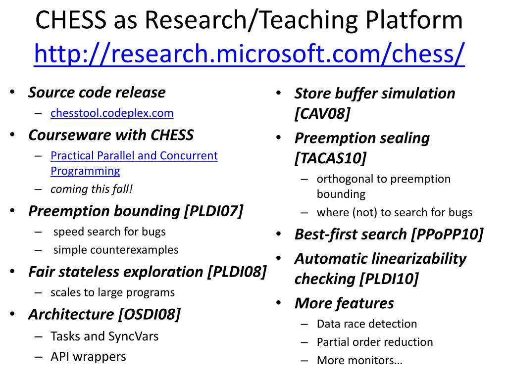 CHESS as Research/Teaching Platformhttp://research.microsoft.com/chess/ • Source code release • chesstool.codeplex.com • Courseware with CHESS • Practical Parallel and Concurrent Programming • coming this fall! • Preemption bounding [PLDI07] • speed search for bugs • simple counterexamples • Fair stateless exploration [PLDI08] • scales to large programs • Architecture [OSDI08] • Tasks and SyncVars • API wrappers • Store buffer simulation [CAV08] • Preemption sealing [TACAS10] • orthogonal to preemption bounding • where (not) to search for bugs • Best-first search [PPoPP10] • Automatic linearizability checking [PLDI10] • More features • Data race detection • Partial order reduction • More monitors…