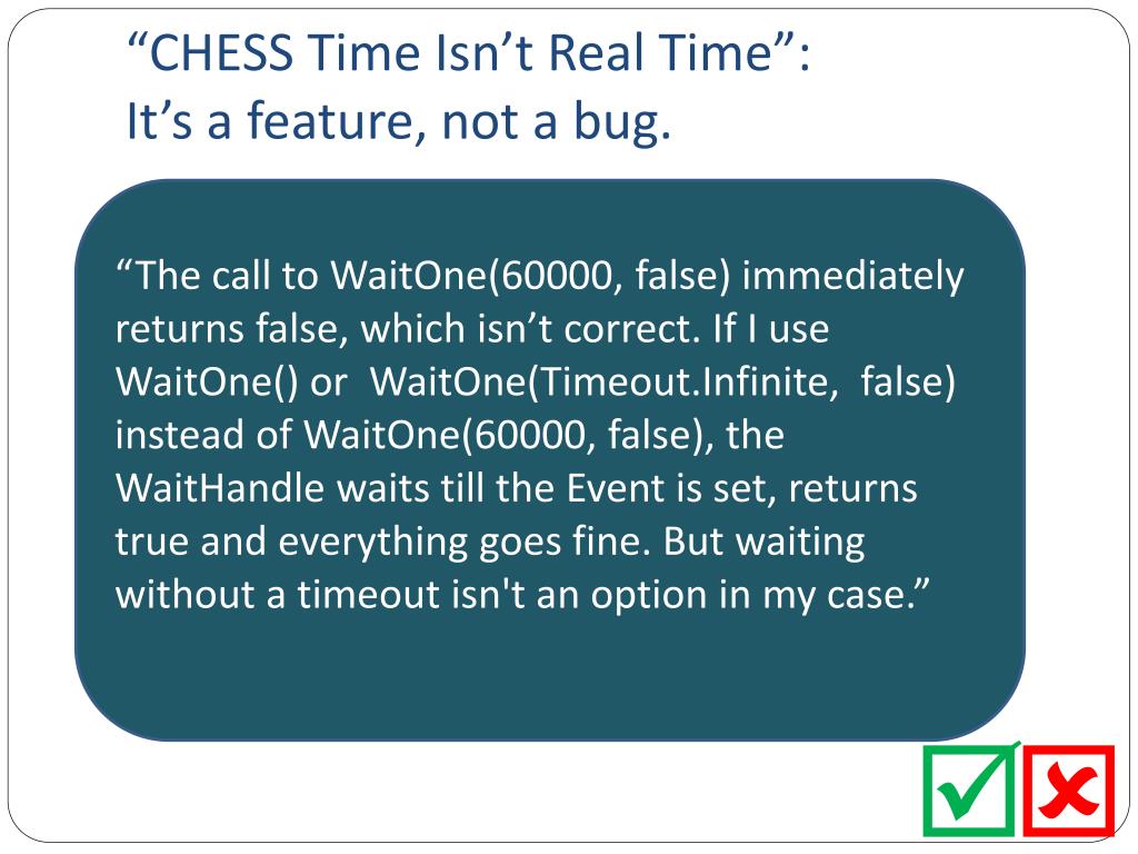 “CHESS Time Isn’t Real Time”: It’s a feature, not a bug. “The call to WaitOne(60000, false) immediately returns false, which isn’t correct. If I use WaitOne() or WaitOne(Timeout.Infinite, false) instead of WaitOne(60000, false), the WaitHandle waits till the Event is set, returns true and everything goes fine. But waiting without a timeout isn't an option in my case.”
