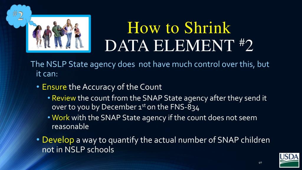 How to ShrinkDATA ELEMENT #2 #2 The NSLP State agency does not have much control over this, but it can: • Ensure the Accuracy of the Count • Reviewthe count from the SNAP State agency after they send it over to you by December 1st on the FNS-834 • Work with the SNAP State agency if the count does not seem reasonable • Develop a way to quantify the actual number of SNAP children not in NSLP schools