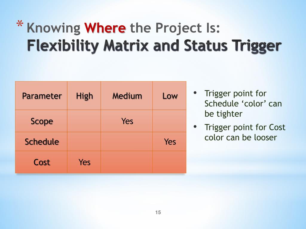 Trigger point for Schedule ‘color’ can be tighter • Trigger point for Cost color can be looser Knowing Where the Project Is:Flexibility Matrix and Status Trigger
