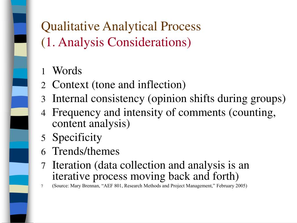 Qualitative Analytical Process(1. Analysis Considerations) • Words • Context (tone and inflection) • Internal consistency (opinion shifts during groups) • Frequency and intensity of comments (counting, content analysis) • Specificity • Trends/themes • Iteration (data collection and analysis is an iterative process moving back and forth) • (Source: Mary Brennan, “AEF 801, Research Methods and Project Management,” February 2005)