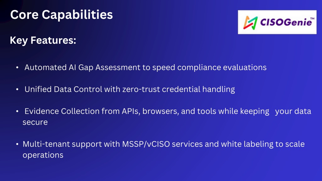 3. Core Capabilities Key Features: • Automated AI Gap Assessment to speed compliance evaluations • Unified Data Control with zero-trust credential handling • Evidence Collection from APIs, browsers, and tools while keeping your data secure • Multi-tenant support with MSSP/vCISO services and white labeling to scale operations