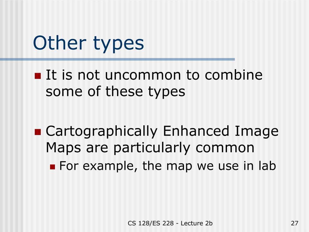 Other types • It is not uncommon to combine some of these types • Cartographically Enhanced Image Maps are particularly common • For example, the map we use in lab CS 128/ES 228 - Lecture 2b