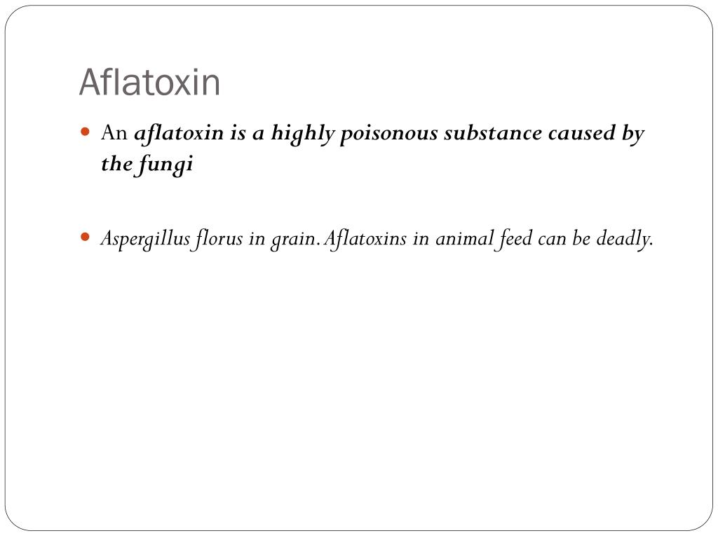 Aflatoxin • An aflatoxin is a highly poisonous substance caused by the fungi • Aspergillus florus in grain. Aflatoxins in animal feed can be deadly.