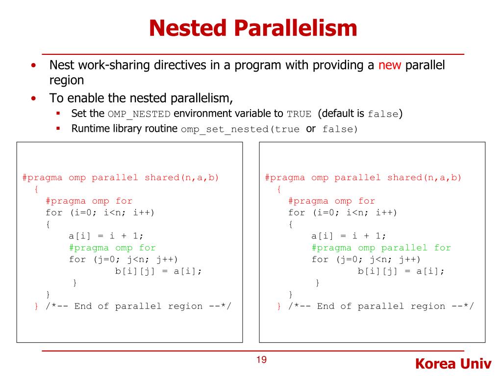 Nested Parallelism • Nest work-sharing directives in a program with providing a new parallel region • To enable the nested parallelism, • Set the OMP_NESTED environment variable to TRUE (default is false) • Runtime library routine omp_set_nested(true or false) #pragmaomp parallel shared(n,a,b) { #pragmaomp for for (i=0; i<n; i++) { a[i] = i + 1; #pragmaomp for for (j=0; j<n; j++) b[i][j] = a[i]; } } } /*-- End of parallel region --*/ #pragmaomp parallel shared(n,a,b) { #pragmaomp for for (i=0; i<n; i++) { a[i] = i + 1; #pragmaomp parallel for for (j=0; j<n; j++) b[i][j] = a[i]; } } } /*-- End of parallel region --*/