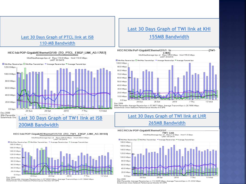 Last 30 Days Graph of TW1 link at ISB 200MB Bandwidth Last 30 Days Graph of PTCL link at ISB 110-MB Bandwidth Last 30 Days Graph of TWI link at KHI 155MB Bandwidth Last 30 Days Graph of TWI link at LHR 265MB Bandwidth