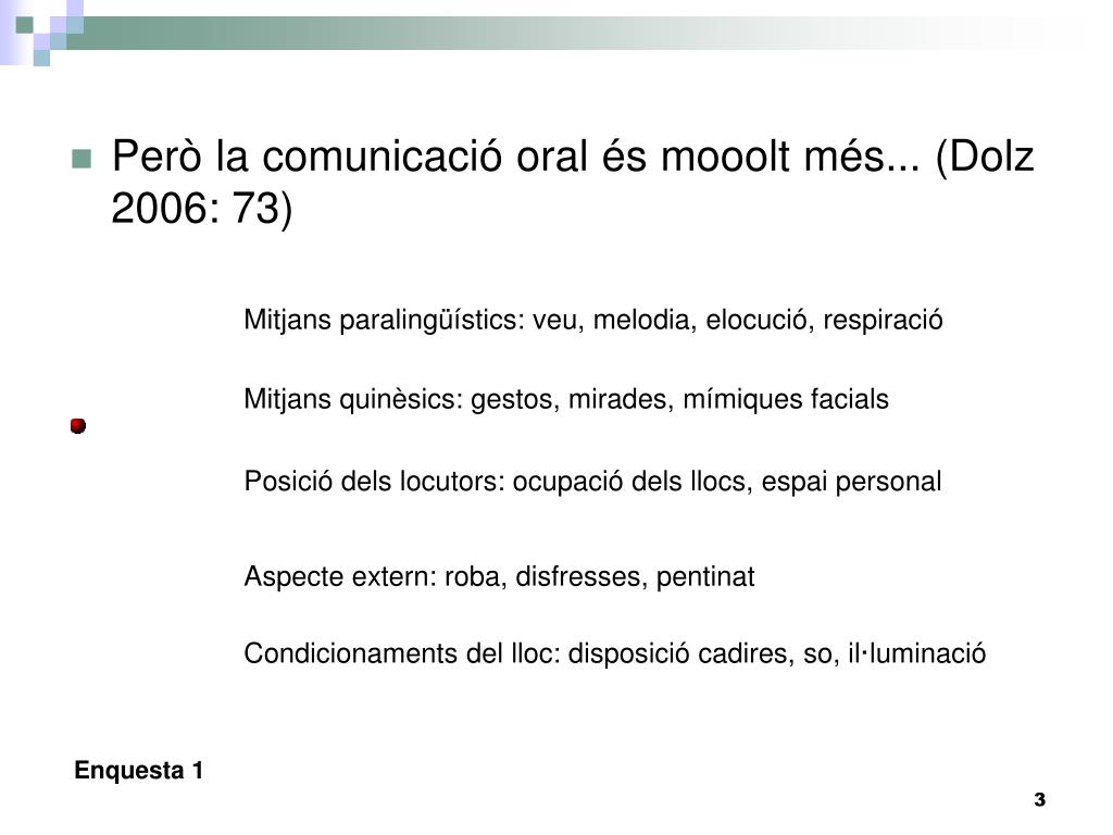 Però la comunicació oral és mooolt més... (Dolz 2006: 73) Mitjans paralingüístics: veu, melodia, elocució, respiració Mitjans quinèsics: gestos, mirades, mímiques facials Posició dels locutors: ocupació dels llocs, espai personal Aspecte extern: roba, disfresses, pentinat Condicionaments del lloc: disposició cadires, so, il·luminació Enquesta 1