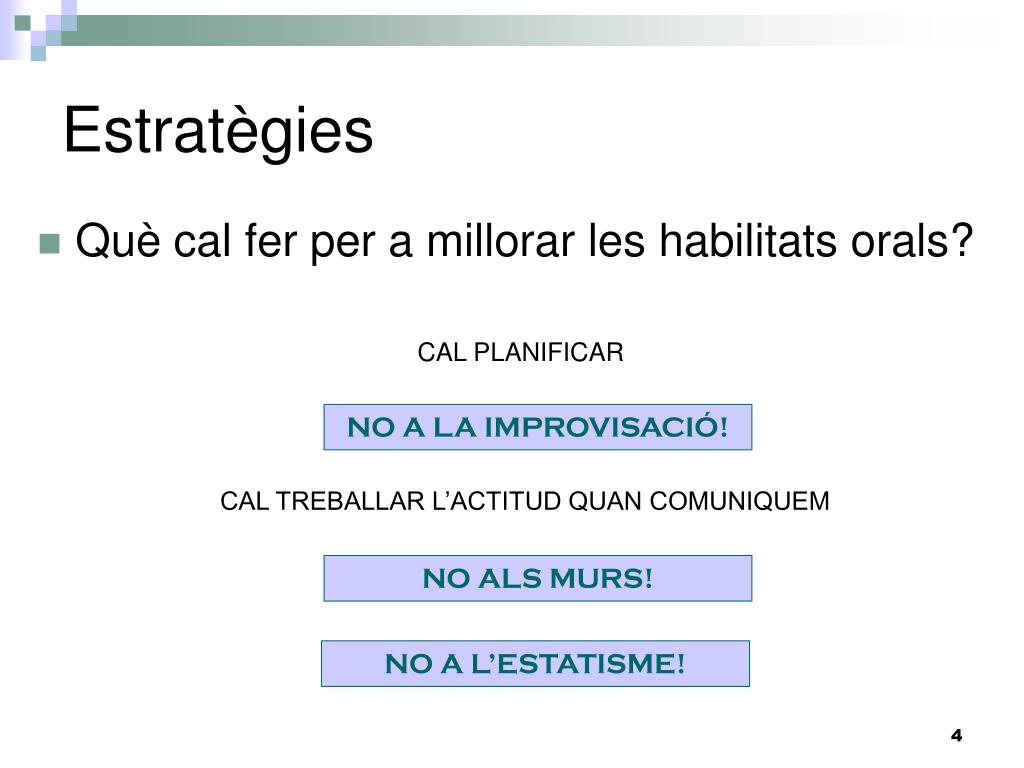 Estratègies • Què cal fer per a millorar les habilitats orals? CAL PLANIFICAR NO A LA IMPROVISACIÓ! CAL TREBALLAR L’ACTITUD QUAN COMUNIQUEM NO ALS MURS! NO A L’ESTATISME!