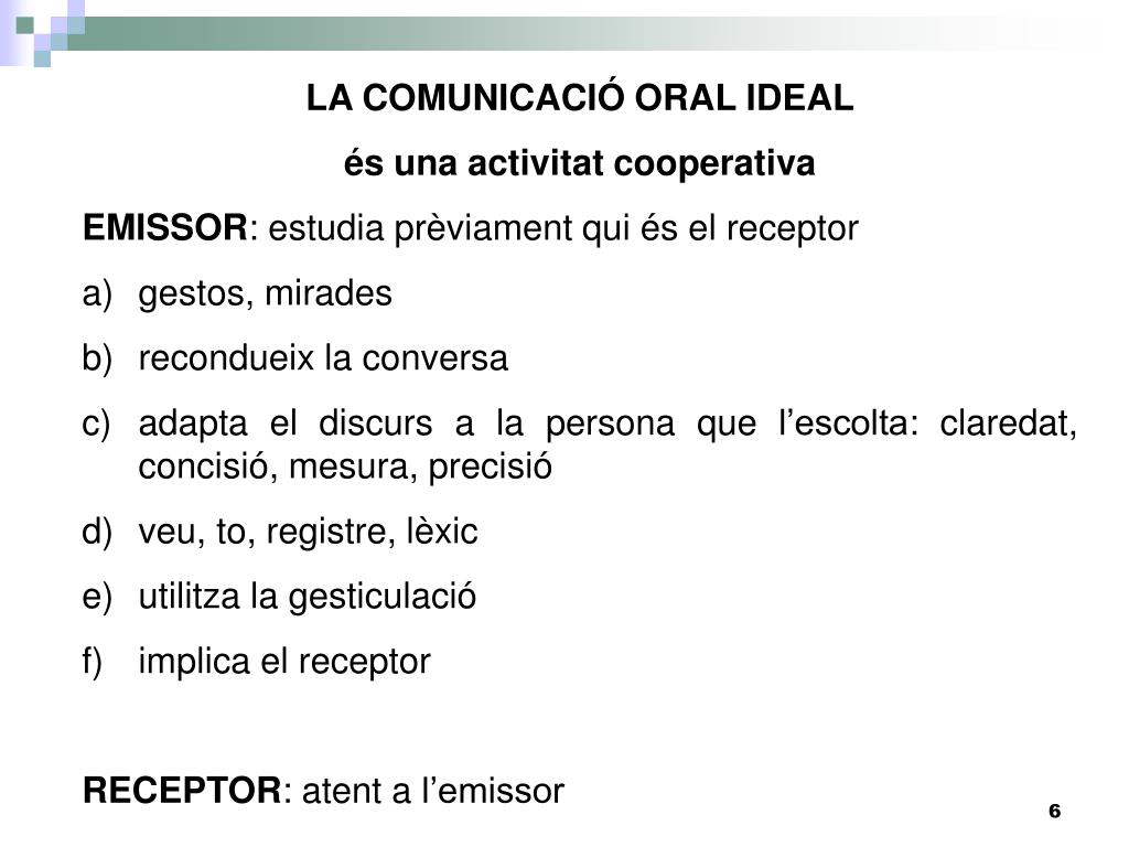 LA COMUNICACIÓ ORAL IDEAL és una activitat cooperativa EMISSOR: estudia prèviament qui és el receptor • gestos, mirades • recondueix la conversa • adapta el discurs a la persona que l’escolta: claredat, concisió, mesura, precisió • veu, to, registre, lèxic • utilitza la gesticulació • implica el receptor RECEPTOR: atent a l’emissor