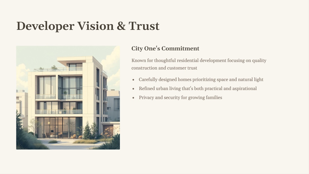 3. Developer Vision & Trust City One's Commitment Known for thoughtful residential development focusing on quality construction and customer trust Carefully designed homes prioritizing space and natural light Refined urban living that's both practical and aspirational Privacy and security for growing families