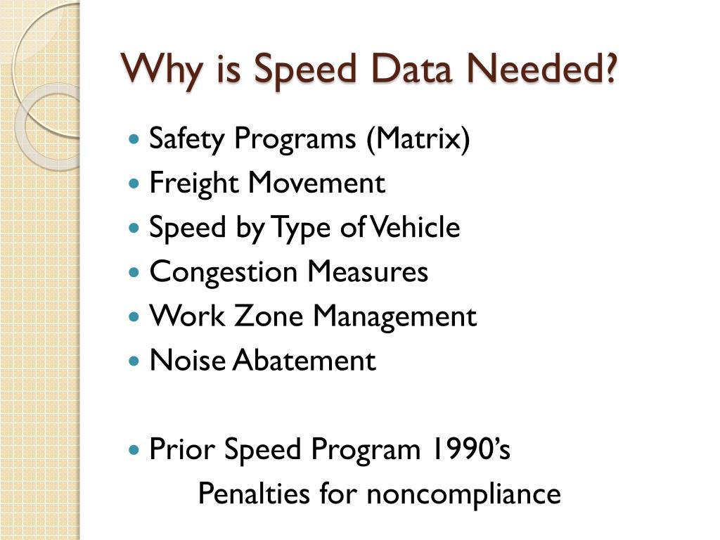 Why is Speed Data Needed? • Safety Programs (Matrix) • Freight Movement • Speed by Type of Vehicle • Congestion Measures • Work Zone Management • Noise Abatement • Prior Speed Program 1990’s Penalties for noncompliance
