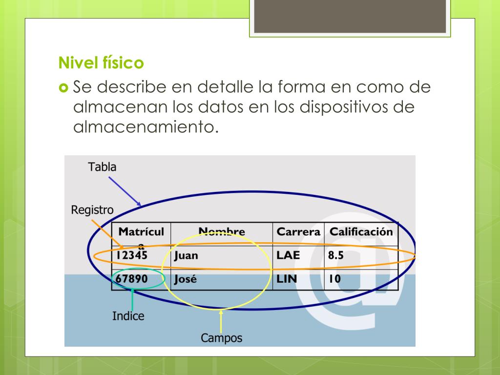 Nivel físico • Se describe en detalle la forma en como de almacenan los datos en los dispositivos de almacenamiento.
