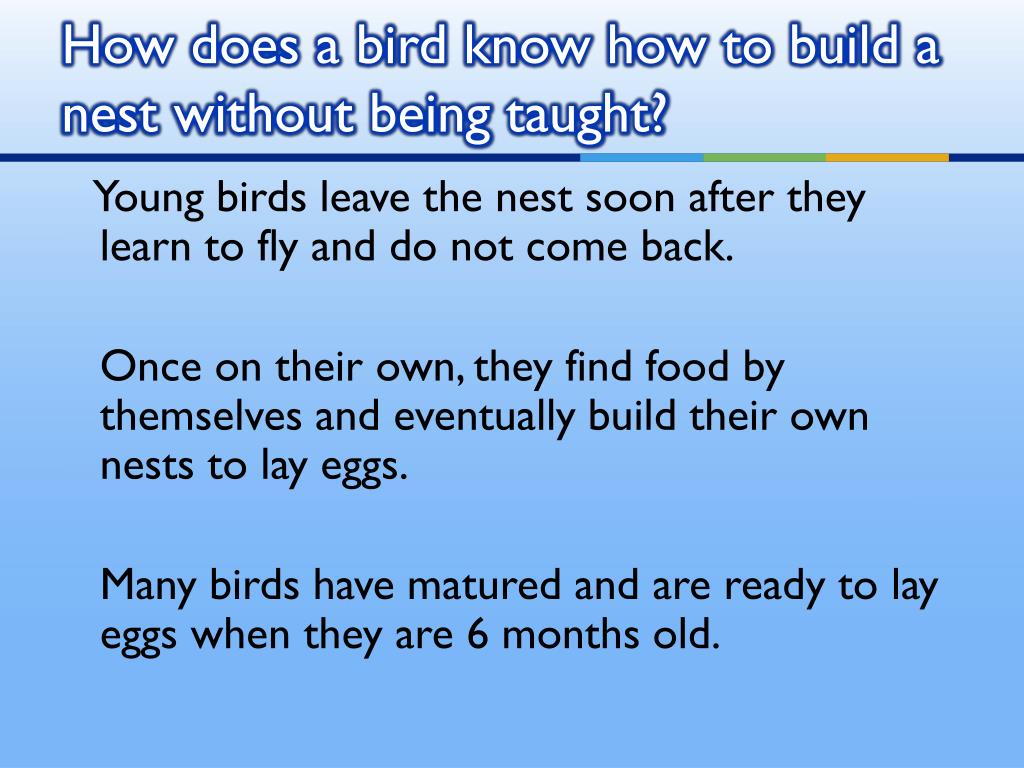 How does a bird know how to build a nest without being taught? Young birds leave the nest soon after they learn to fly and do not come back. Once on their own, they find food by themselves and eventually build their own nests to lay eggs. Many birds have matured and are ready to lay eggs when they are 6 months old.