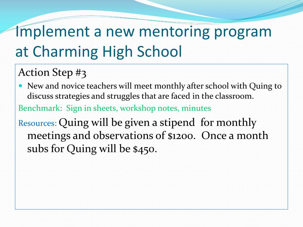 Implement a new mentoring program at Charming High School Action Step #3 • New and novice teachers will meet monthly after school with Quing to discuss strategies and struggles that are faced in the classroom. Benchmark: Sign in sheets, workshop notes, minutes Resources: Quing will be given a stipend for monthly meetings and observations of $1200. Once a month subs for Quing will be $450.