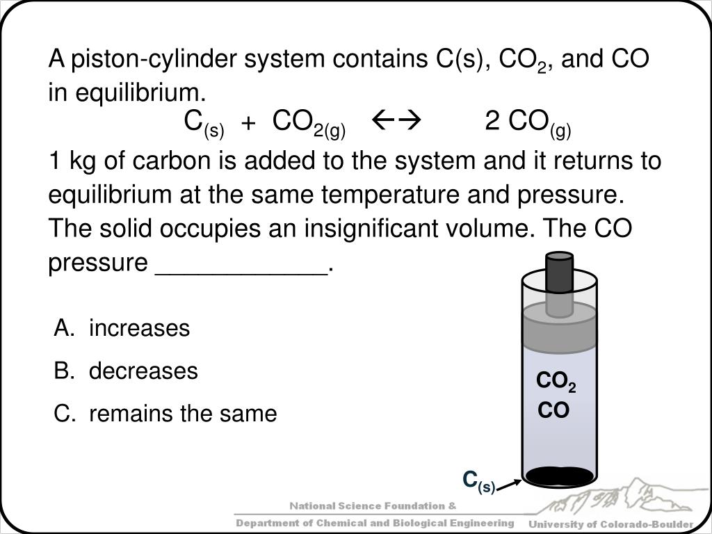 A piston-cylinder system contains C(s), CO2, and CO in equilibrium. 1 kg of carbon is added to the system and it returns to equilibrium at the same temperature and pressure. The solid occupies an insignificant volume. The CO pressure ____________. increases decreases remains the same C(s) + CO2(g) 2 CO(g) CO2 CO C(s)