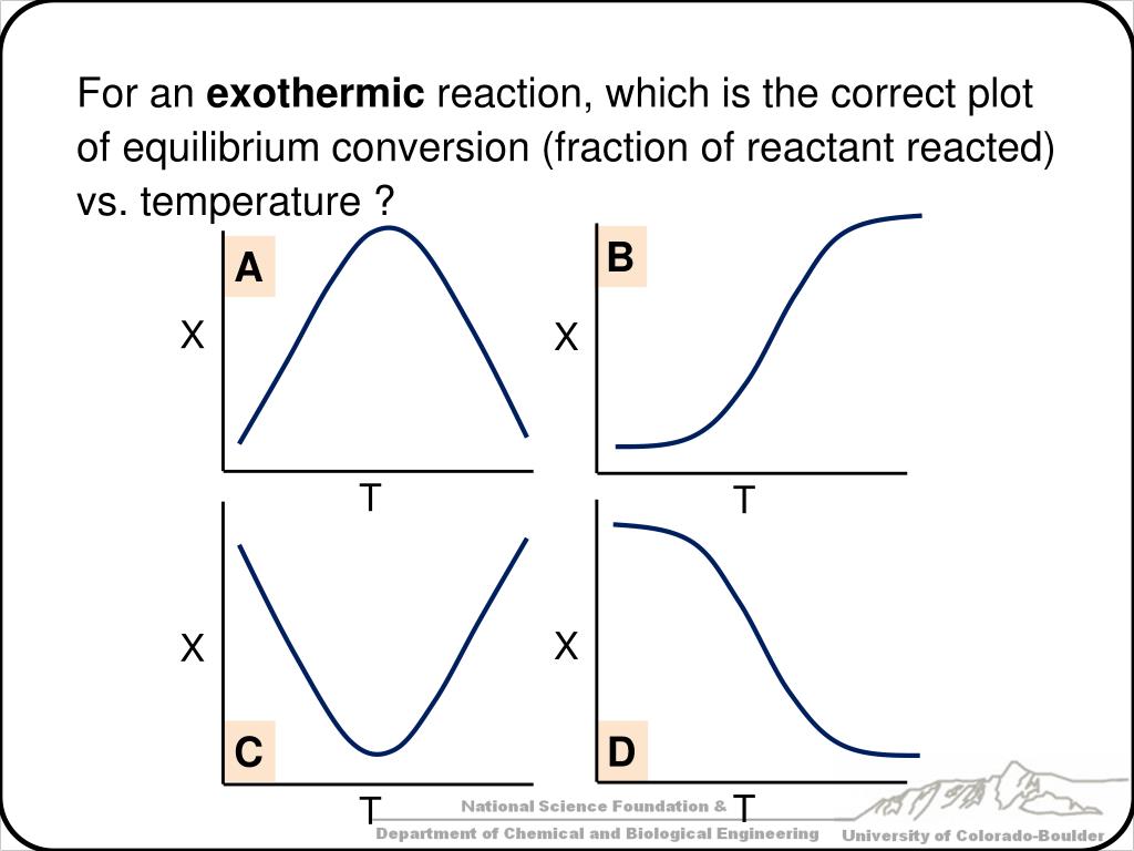 X X X X T T T T For an exothermic reaction, which is the correct plot of equilibrium conversion (fraction of reactant reacted) vs. temperature ? B A C D