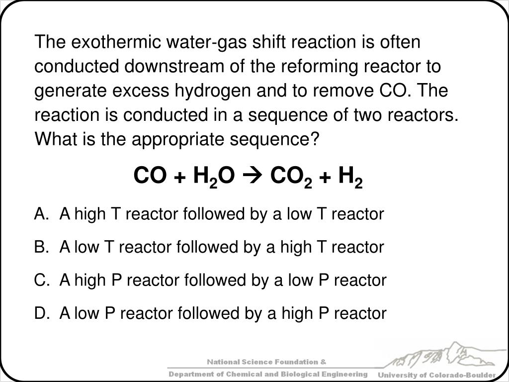 The exothermic water‐gas shift reaction is often conducted downstream of the reforming reactor to generate excess hydrogen and to remove CO. The reaction is conducted in a sequence of two reactors. What is the appropriate sequence? A high T reactor followed by a low T reactor A low T reactor followed by a high T reactor A high P reactor followed by a low P reactor A low P reactor followed by a high P reactor CO + H2O CO2 + H2