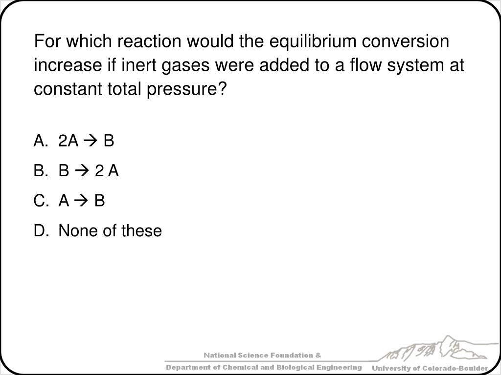 Consider the two reaction and their equilibrium constants: Which conclusion is incorrect? Reaction 1 reaches equilibrium first Reaction 2 reaches equilibrium first Reaction 2 has a higher conversion at equilibrium None of these A + B C K1= 1000 A + D 3 E K2= 78