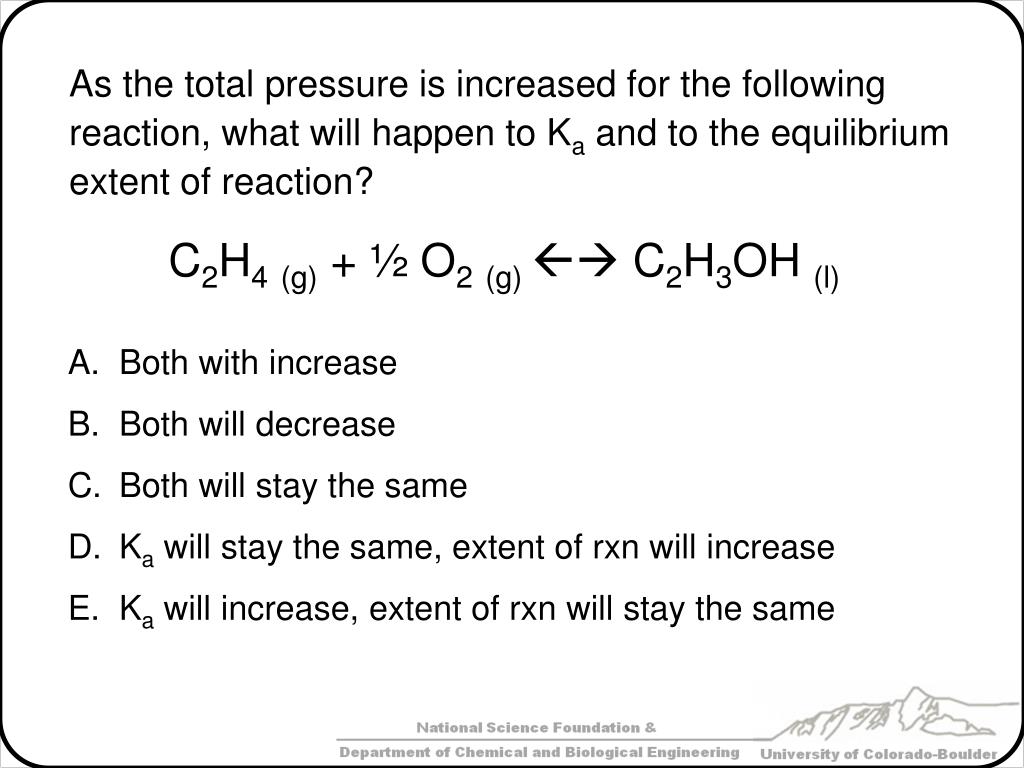 As the total pressure is increased for the following reaction, what will happen to Ka and to the equilibrium extent of reaction? Both with increase Both will decrease Both will stay the same Ka will stay the same, extent of rxn will increase Ka will increase, extent of rxn will stay the same C2H4(g) + ½ O2(g) C2H3OH (l)