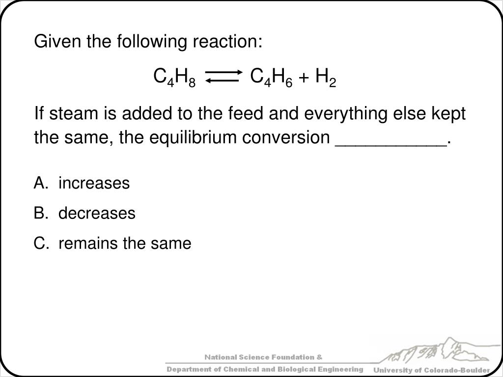 Given the following reaction: If steam is added to the feed and everything else kept the same, the equilibrium conversion ___________. increases decreases remains the same C4H8 C4H6+ H2
