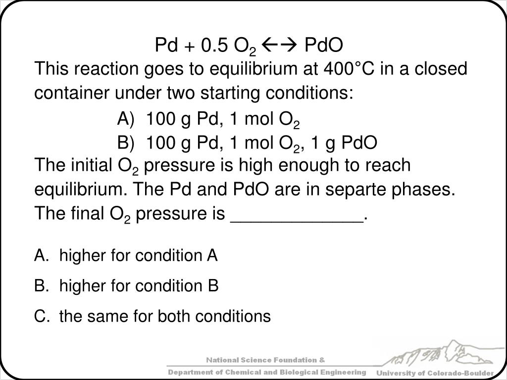 This reaction goes to equilibrium at 400°C in a closed container under two starting conditions: • 100 g Pd, 1 mol O2 • 100 g Pd, 1 mol O2, 1 g PdO The initial O2 pressure is high enough to reach equilibrium. The Pd and PdO are in separte phases. The final O2 pressure is _____________. higher for condition A higher for condition B the same for both conditions Pd + 0.5 O2 PdO