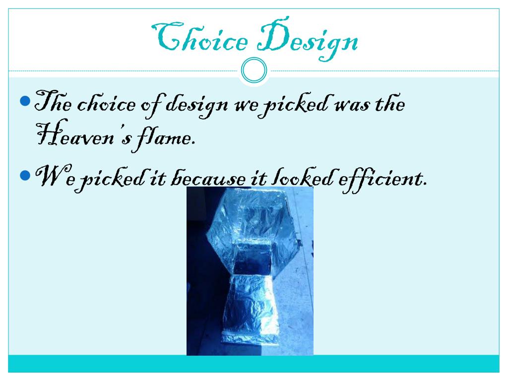 ChoiceDesign Thechoice of designwepickedwastheHeaven’sflame. Wepickeditbecauseitlookedefficient.