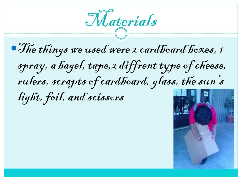 Materials Thethingsweusedwere 2 cardboard boxes, 1 spray, a bagel, tape,2 diffrenttype of cheese, rulers, scrapts of cardboard, glass, thesun’s light, foil, and scissors