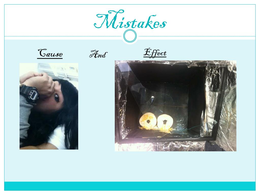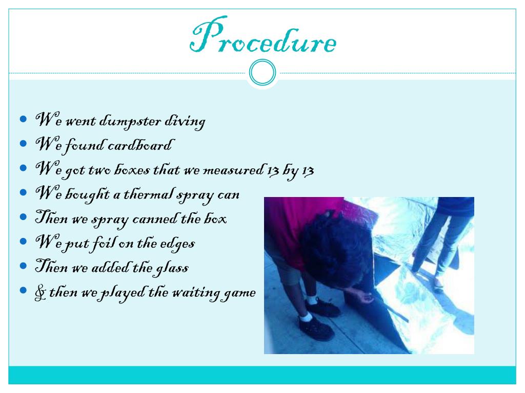 Procedure Wewentdumpsterdiving Wefoundcardboard Wegottwo boxes thatwemeasured 13 by 13 Webought a thermalspray can Thenwespraycannedthe box Weputfoilontheedges Thenweaddedtheglass & thenweplayedthewaitinggame