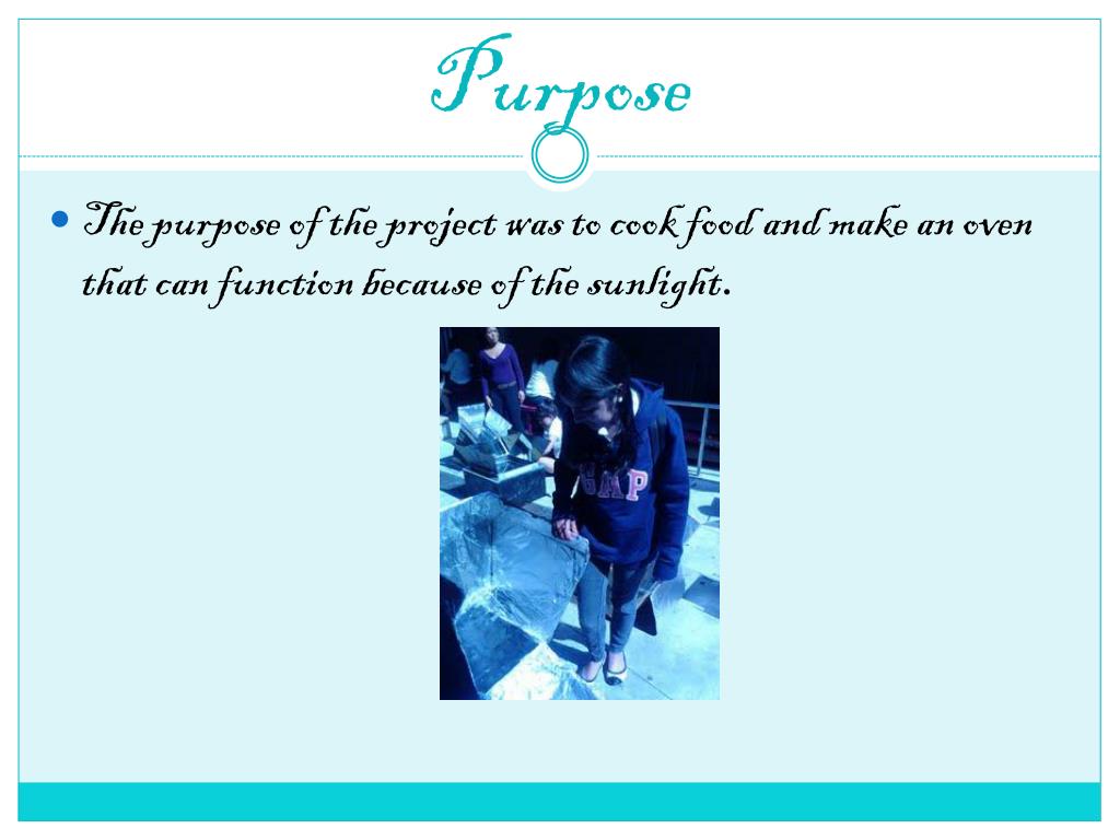Purpose Thepurpose of theprojectwastocookfood and makean oven that can functionbecause of thesunlight.