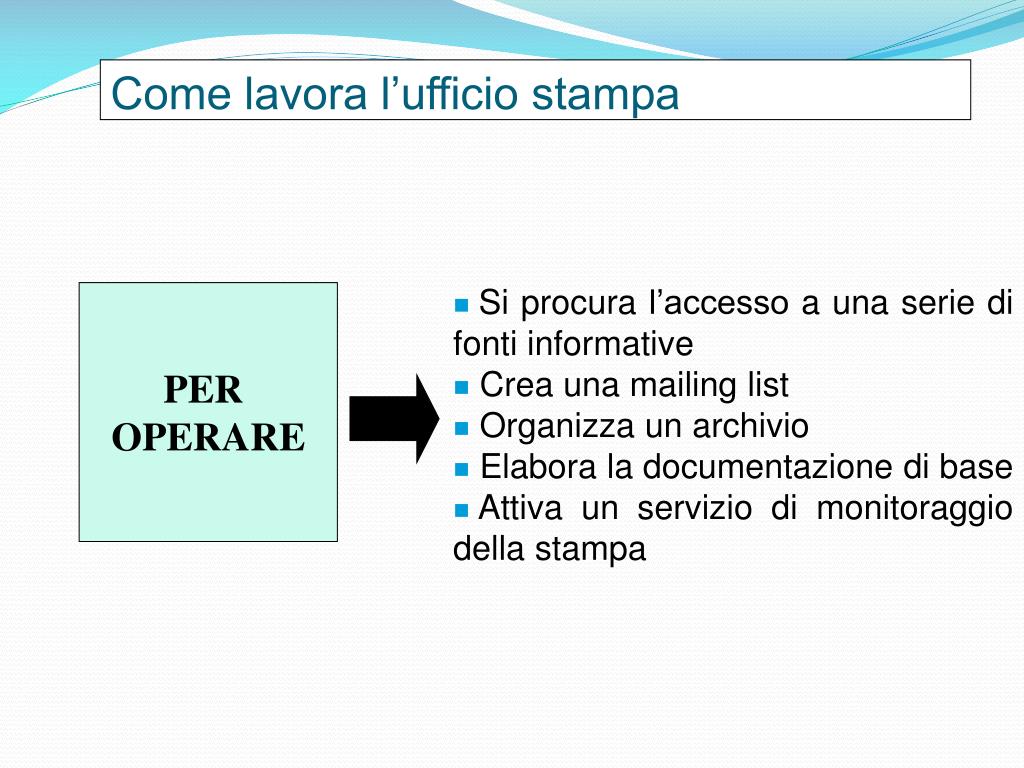 Come lavora l’ufficio stampa • Si procura l’accesso a una serie di fonti informative • Crea una mailing list • Organizza un archivio • Elabora la documentazione di base • Attiva un servizio di monitoraggio della stampa PER OPERARE