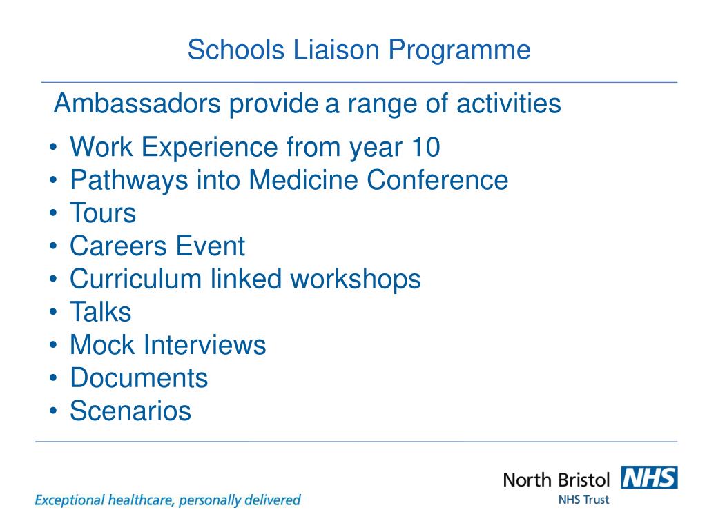 Schools Liaison Programme • Ambassadors providea range of activities • Work Experience from year 10 • Pathways into Medicine Conference • Tours • Careers Event • Curriculum linked workshops • Talks • Mock Interviews • Documents • Scenarios
