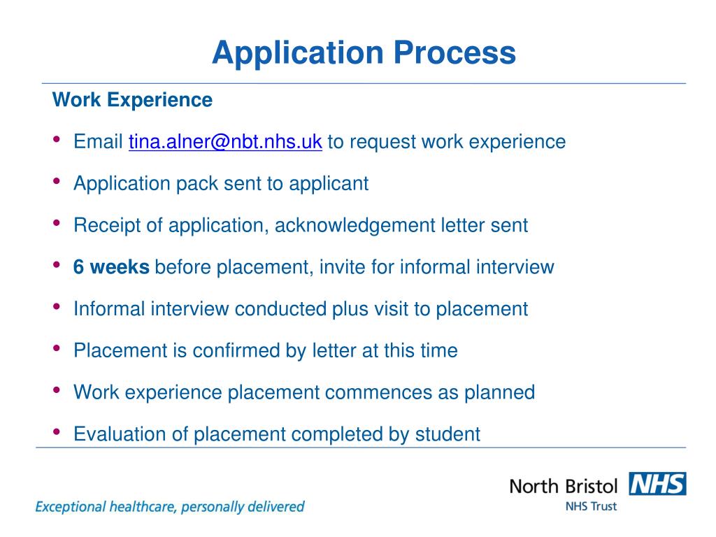 Application Process • Work Experience • Email tina.alner@nbt.nhs.uk to request work experience • Application pack sent to applicant • Receipt of application, acknowledgement letter sent • 6 weeks before placement, invite for informal interview • Informal interview conducted plus visit to placement • Placement is confirmed by letter at this time • Work experience placement commences as planned • Evaluation of placement completed by student
