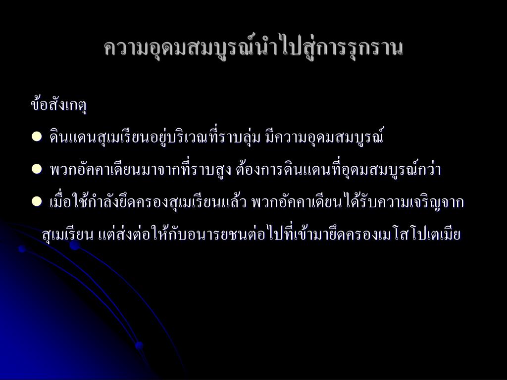 ความอุดมสมบูรณ์นำไปสู่การรุกรานความอุดมสมบูรณ์นำไปสู่การรุกราน ข้อสังเกตุ • ดินแดนสุเมเรียนอยู่บริเวณที่ราบลุ่ม มีความอุดมสมบูรณ์ • พวกอัคคาเดียนมาจากที่ราบสูง ต้องการดินแดนที่อุดมสมบูรณ์กว่า • เมื่อใช้กำลังยึดครองสุเมเรียนแล้ว พวกอัคคาเดียนได้รับความเจริญจาก สุเมเรียน แต่ส่งต่อให้กับอนารยชนต่อไปที่เข้ามายึดครองเมโสโปเตเมีย