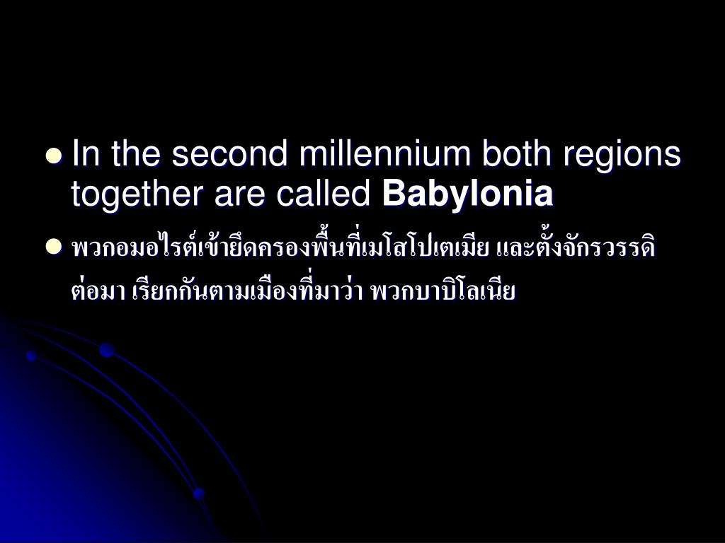 In the second millennium both regions together are called Babylonia • พวกอมอไรต์เข้ายึดครองพื้นที่เมโสโปเตเมีย และตั้งจักรวรรดิต่อมา เรียกกันตามเมืองที่มาว่า พวกบาบิโลเนีย