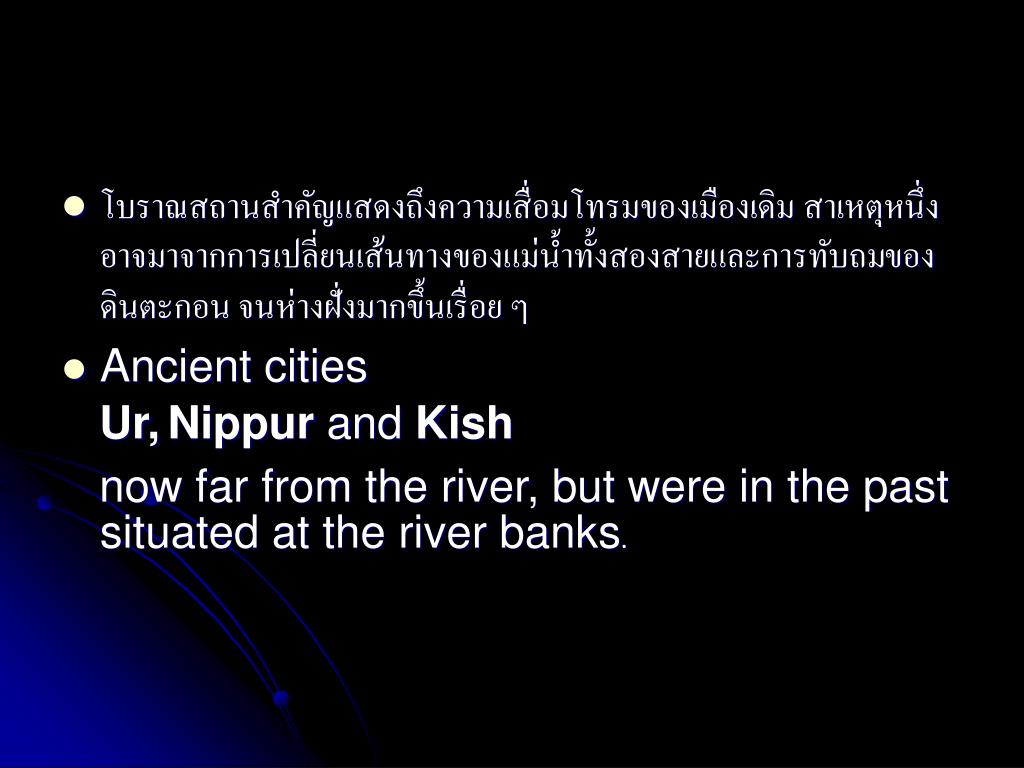 โบราณสถานสำคัญแสดงถึงความเสื่อมโทรมของเมืองเดิม สาเหตุหนึ่งอาจมาจากการเปลี่ยนเส้นทางของแม่น้ำทั้งสองสายและการทับถมของดินตะกอน จนห่างฝั่งมากขึ้นเรื่อย ๆ • Ancient cities Ur,Nippur and Kish now far from the river, but were in the past situated at the river banks.