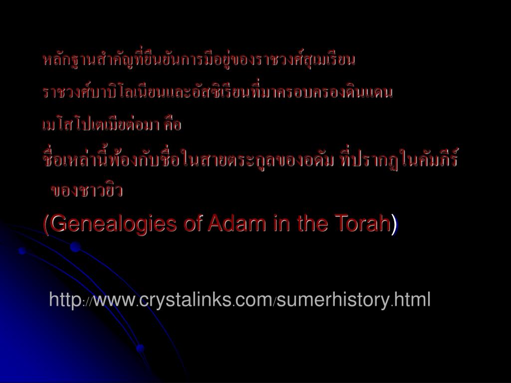 วรรณกรรม Gilgamesh • ปรากฏเรื่องน้ำท่วมโลกและการสร้างชีวิตใหม่หลังน้ำท่วม • ชื่อวีรบุรุษกีลกาเมส ปรากฏในหลักฐานทางโบราณคดี • การกล่าวถึงชื่อเทพเจ้า ตรงกับที่ปรากฏในหลักฐานหลายแห่ง http://www.crystalinks.com/sumerhistory.html
