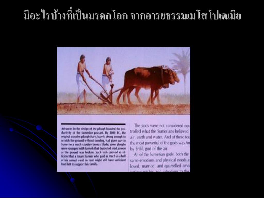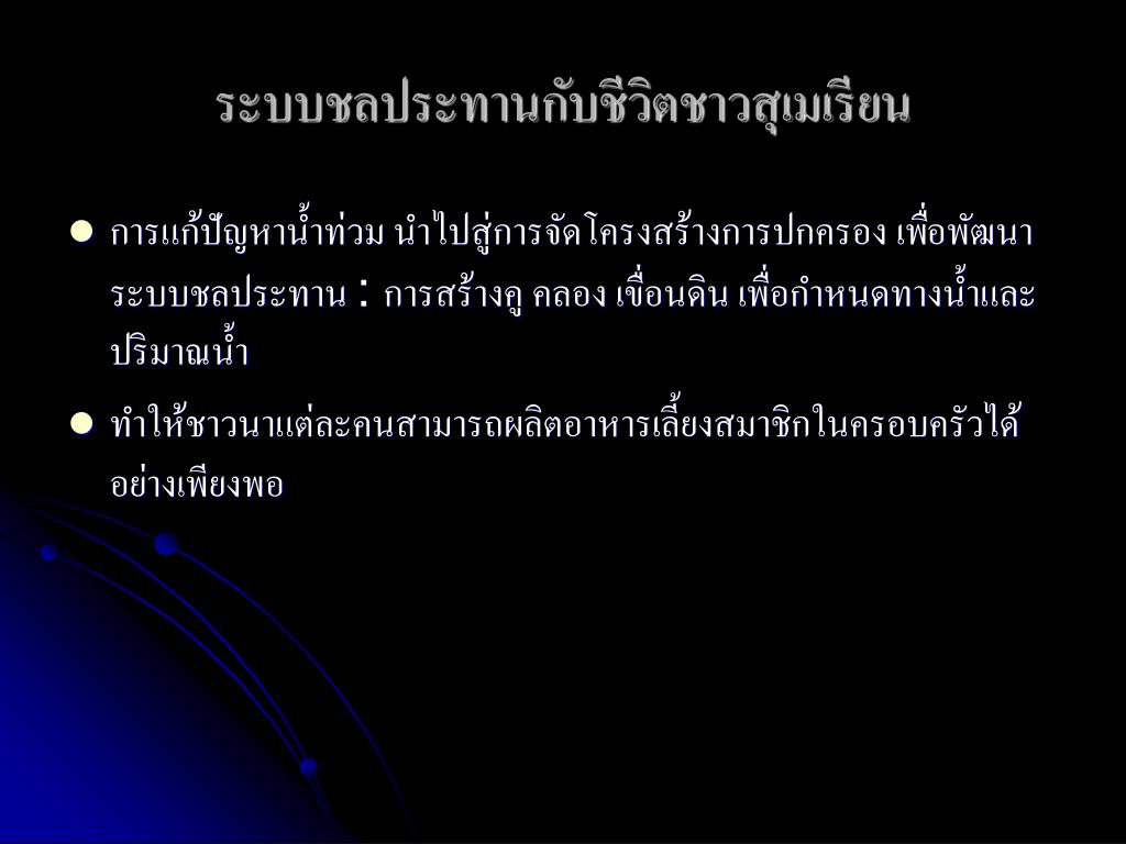 ระบบชลประทานกับชีวิตชาวสุเมเรียนระบบชลประทานกับชีวิตชาวสุเมเรียน • การแก้ปัญหาน้ำท่วม นำไปสู่การจัดโครงสร้างการปกครอง เพื่อพัฒนาระบบชลประทาน : การสร้างคู คลอง เขื่อนดิน เพื่อกำหนดทางน้ำและปริมาณน้ำ • ทำให้ชาวนาแต่ละคนสามารถผลิตอาหารเลี้ยงสมาชิกในครอบครัวได้อย่างเพียงพอ