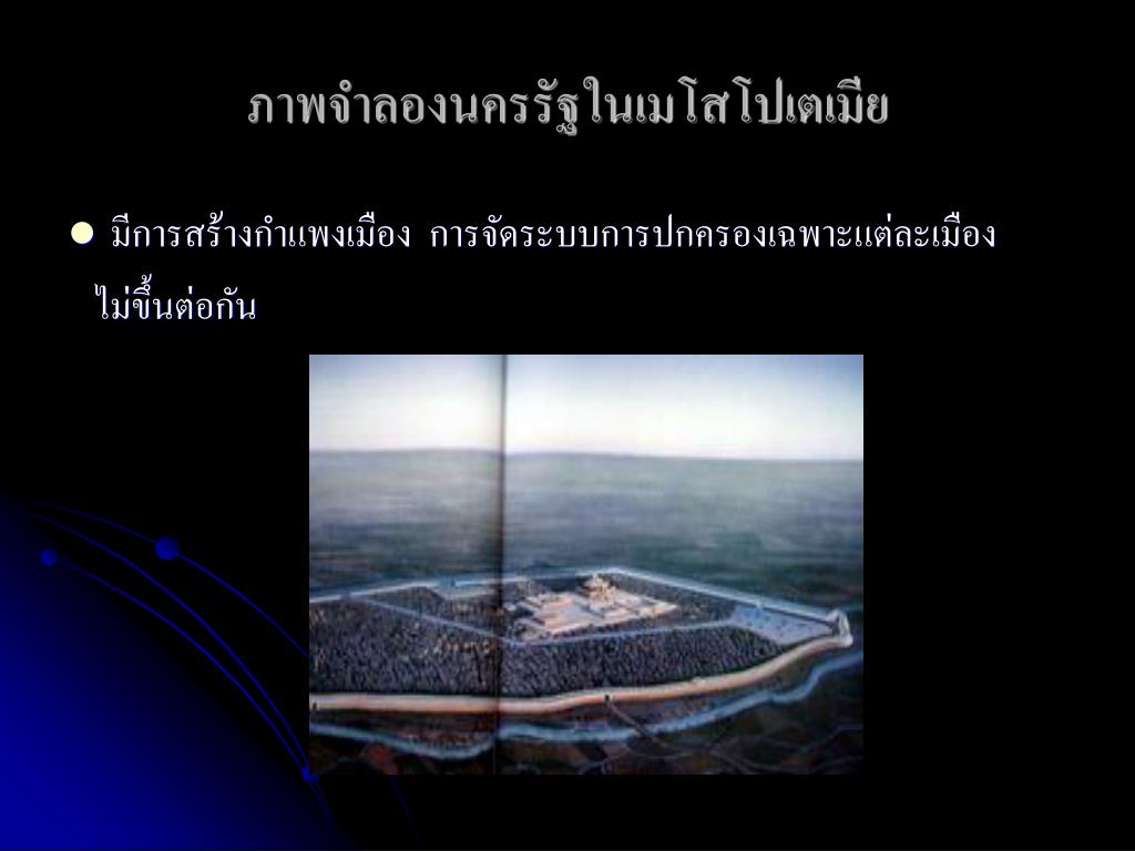 ภาพจำลองนครรัฐในเมโสโปเตเมียภาพจำลองนครรัฐในเมโสโปเตเมีย • มีการสร้างกำแพงเมือง การจัดระบบการปกครองเฉพาะแต่ละเมือง ไม่ขึ้นต่อกัน