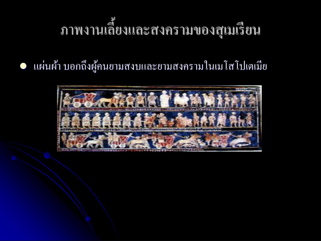 ภาพงานเลี้ยงและสงครามของสุเมเรียนภาพงานเลี้ยงและสงครามของสุเมเรียน • แผ่นผ้า บอกถึงผู้คนยามสงบและยามสงครามในเมโสโปเตเมีย
