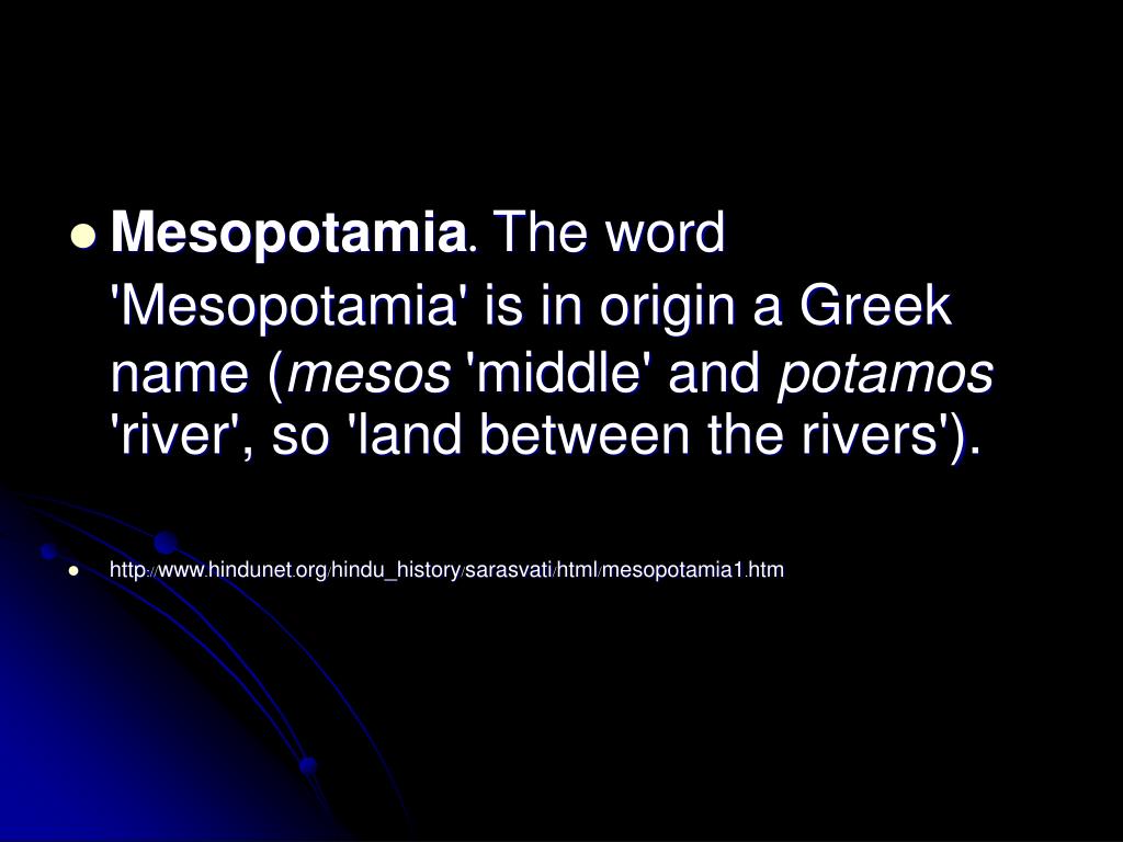 Mesopotamia. The word 'Mesopotamia' is in origin a Greek name (mesos 'middle' and potamos 'river', so 'land between the rivers'). • http://www.hindunet.org/hindu_history/sarasvati/html/mesopotamia1.htm
