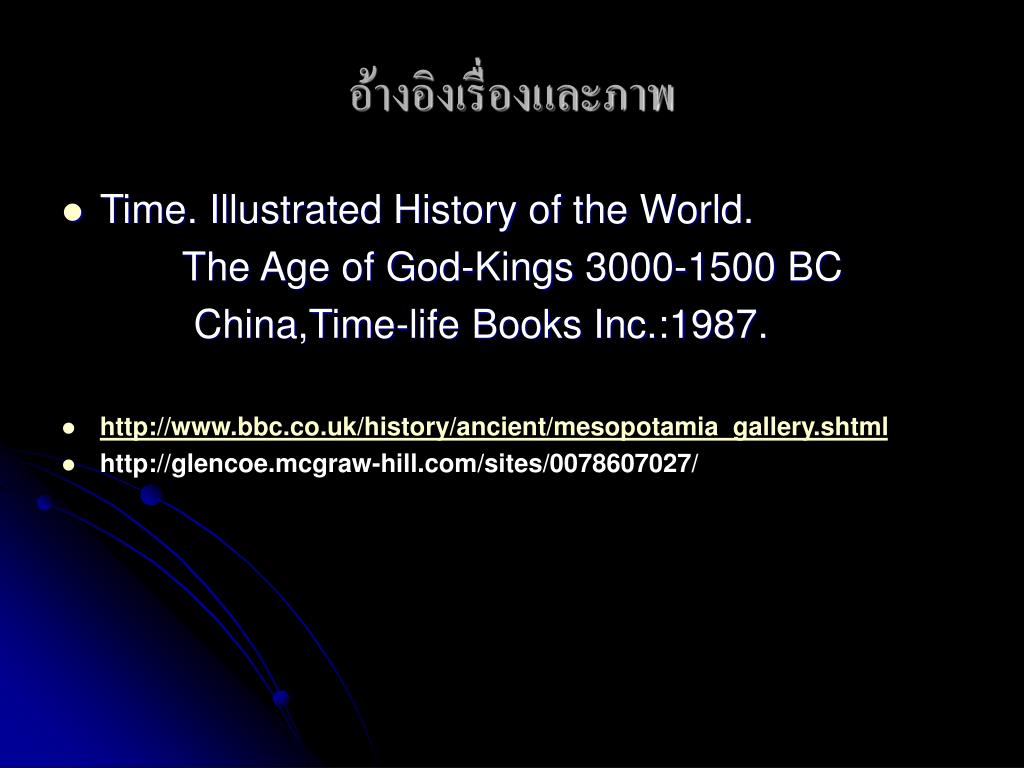อ้างอิงเรื่องและภาพ • Time. Illustrated History of the World. The Age of God-Kings 3000-1500 BC China,Time-life Books Inc.:1987. • http://www.bbc.co.uk/history/ancient/mesopotamia_gallery.shtml • http://glencoe.mcgraw-hill.com/sites/0078607027/
