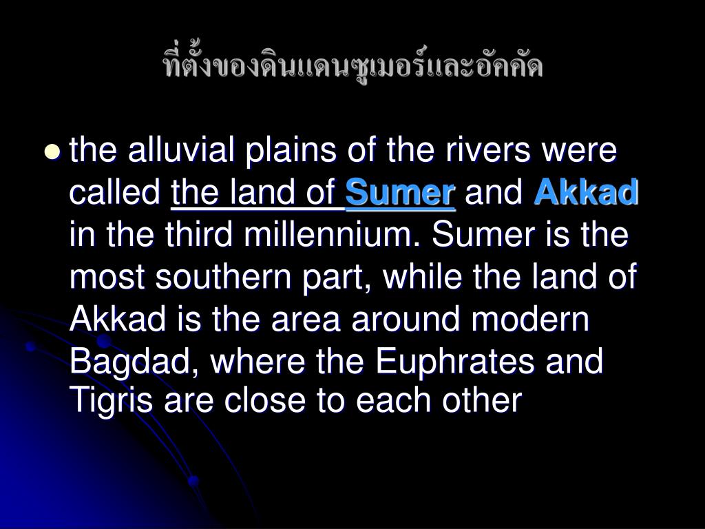 ที่ตั้งของดินแดนซูเมอร์และอัคคัดที่ตั้งของดินแดนซูเมอร์และอัคคัด • the alluvial plains of the rivers were called the land of Sumer and Akkad in the third millennium. Sumer is the most southern part, while the land of Akkad is the area around modern Bagdad, where the Euphrates and Tigris are close to each other