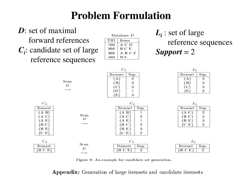 Problem Formulation D: set of maximal forward references Ci: candidate set of large reference sequences Li : set of large reference sequences Support = 2