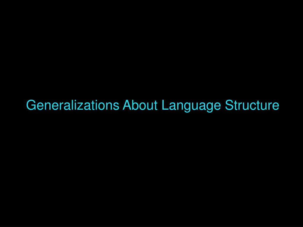 Greenberg’s Word Order Generalizations Greenberg found forty-five “universals” of languages - patterns overwhelmingly followed by languages with unshared history (Navajo & Japanese, English & Edo) Not all combinations are possible - some patterns rarely appear Ex: Subject Verb Object language (English/Edo-like) + postpositions (Navajo/Japanese-like) Moral: Languages may be more similar than they first appear “on the surface”, especially if we consider their structural properties.