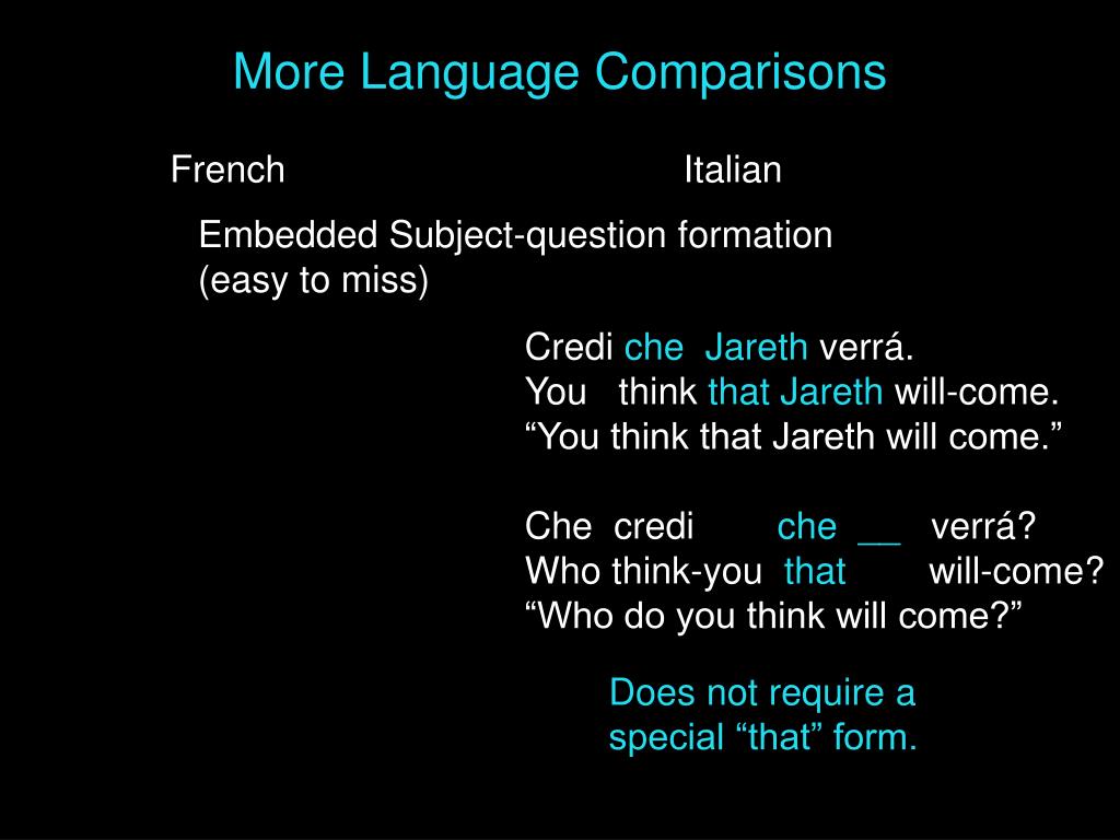 More Language Comparisons French Italian Embedded Subject-question formation (easy to miss) Credi che Jareth verrá. You think thatJareth will-come. “You think that Jareth will come.” Che credi che __ verrá? Who think-you that will-come? “Who do you think will come?” Does not require a special “that” form.