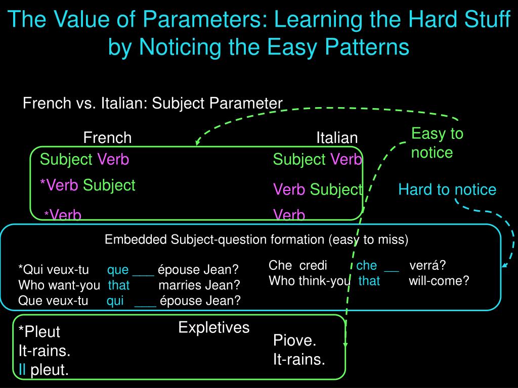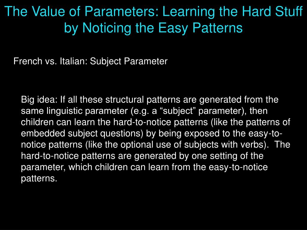 The Value of Parameters: Learning the Hard Stuff by Noticing the Easy Patterns French vs. Italian: Subject Parameter Big idea: If all these structural patterns are generated from the same linguistic parameter (e.g. a “subject” parameter), then children can learn the hard-to-notice patterns (like the patterns of embedded subject questions) by being exposed to the easy-to-notice patterns (like the optional use of subjects with verbs). The hard-to-notice patterns are generated by one setting of the parameter, which children can learn from the easy-to-notice patterns.