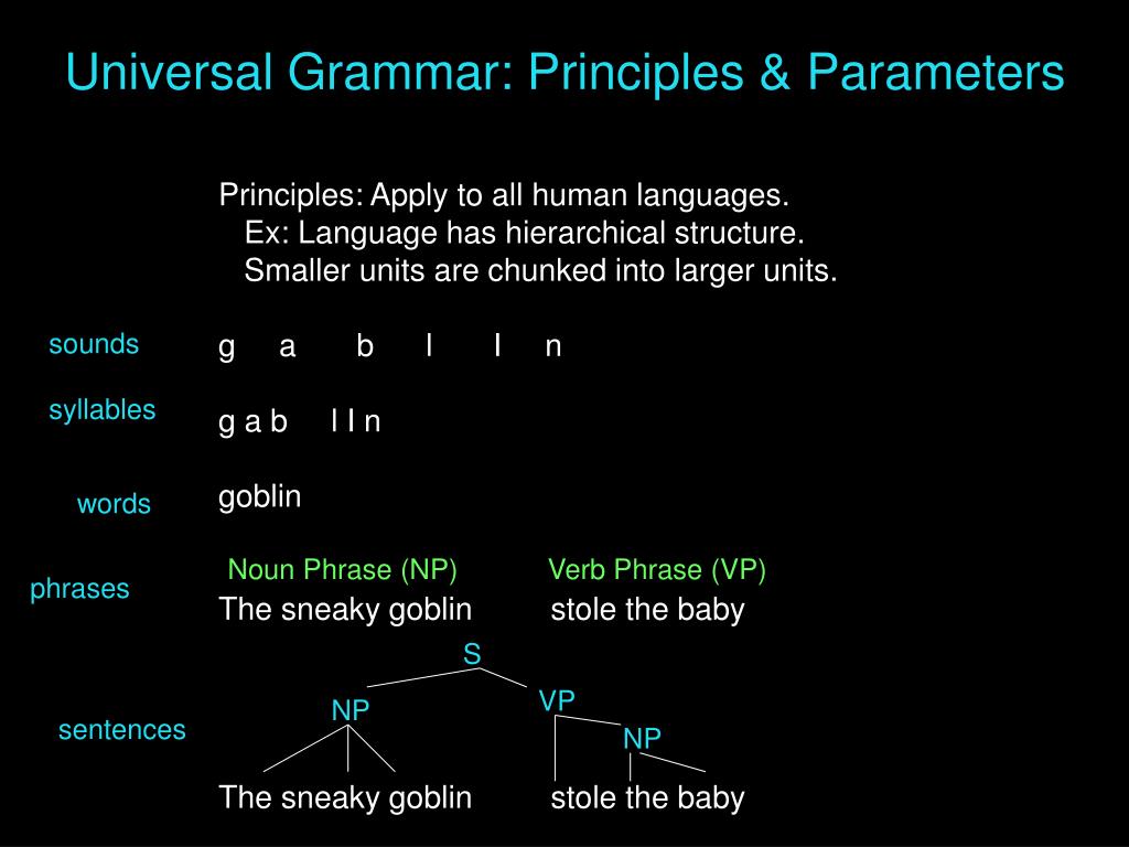 Universal Grammar: Principles & Parameters Principles: Apply to all human languages. Ex: Language has hierarchical structure. Smaller units are chunked into larger units. g a b l I n g a b l I n goblin The sneaky goblin stole the baby The sneaky goblin stole the baby sounds syllables words Noun Phrase (NP) Verb Phrase (VP) phrases S VP NP sentences NP