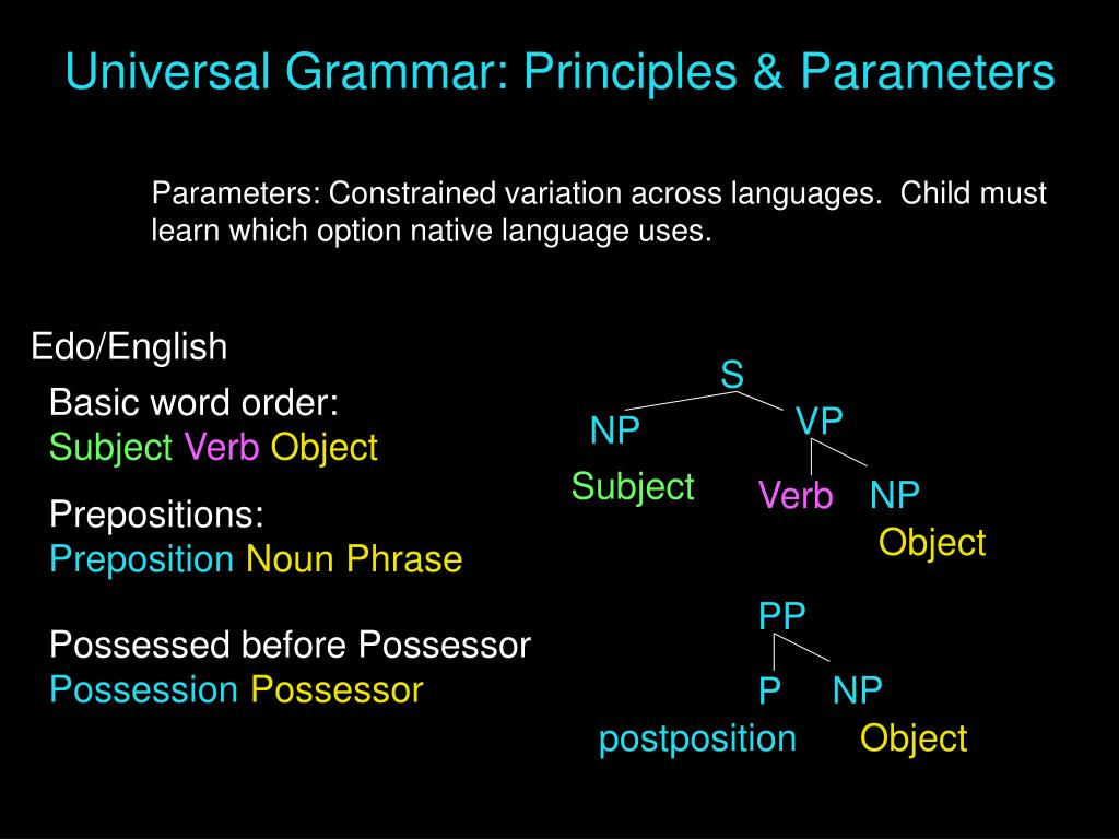 Universal Grammar: Principles & Parameters Parameters: Constrained variation across languages. Child must learn which option native language uses. Edo/English S Basic word order: Subject Verb Object VP NP Subject Verb NP Prepositions: Preposition Noun Phrase Object PP Possessed before Possessor PossessionPossessor NP P postposition Object